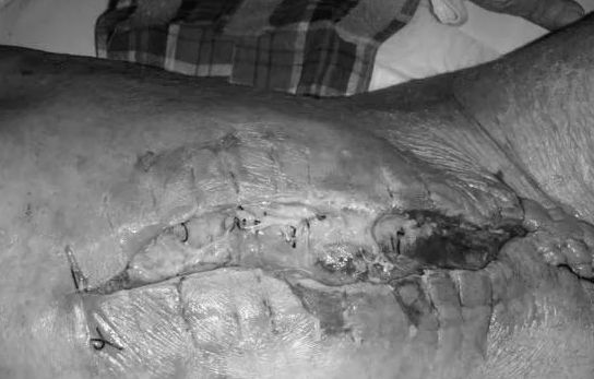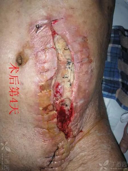 术后带管至 ICU,第 4 天见切口感染(图 1),予负压吸引(图 2)。
